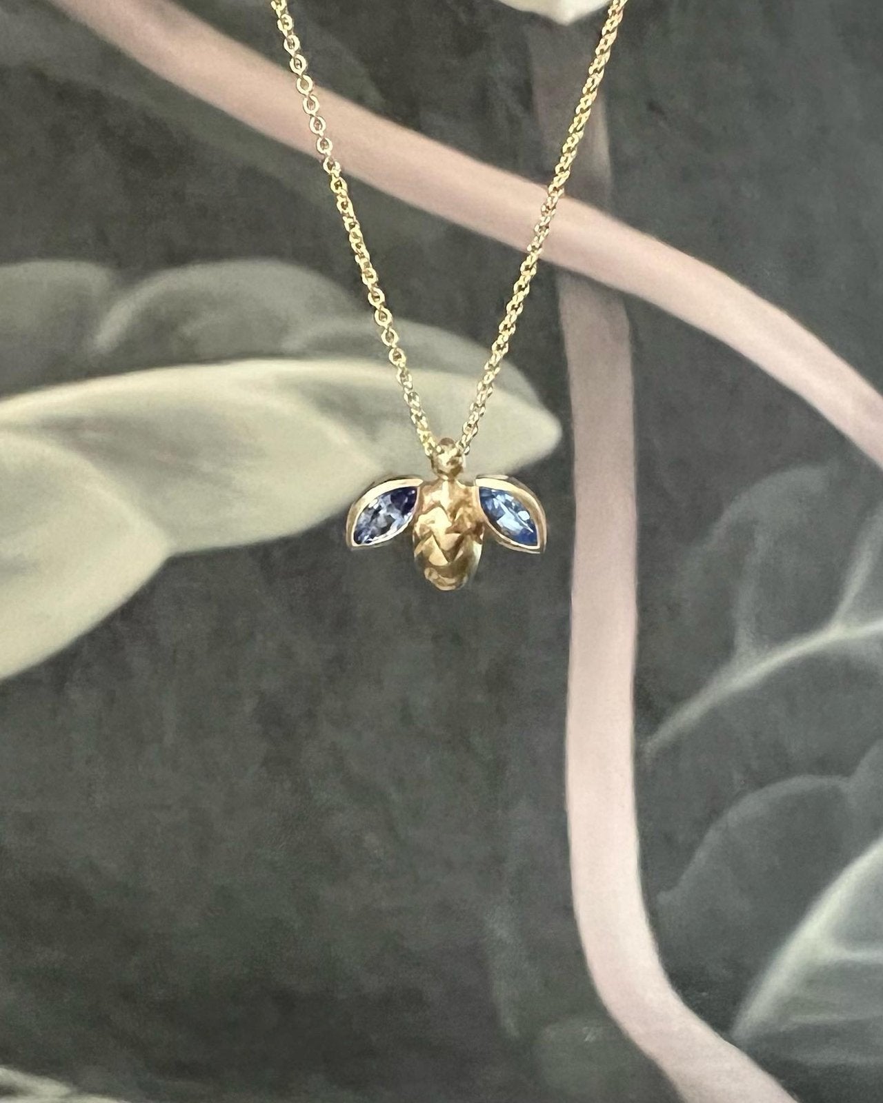 Tiny bug pendant carved in wax and cast in 18K gold. Set with marquise pink tourmaline or blue sapphire. Hangs on 16 inch chain.