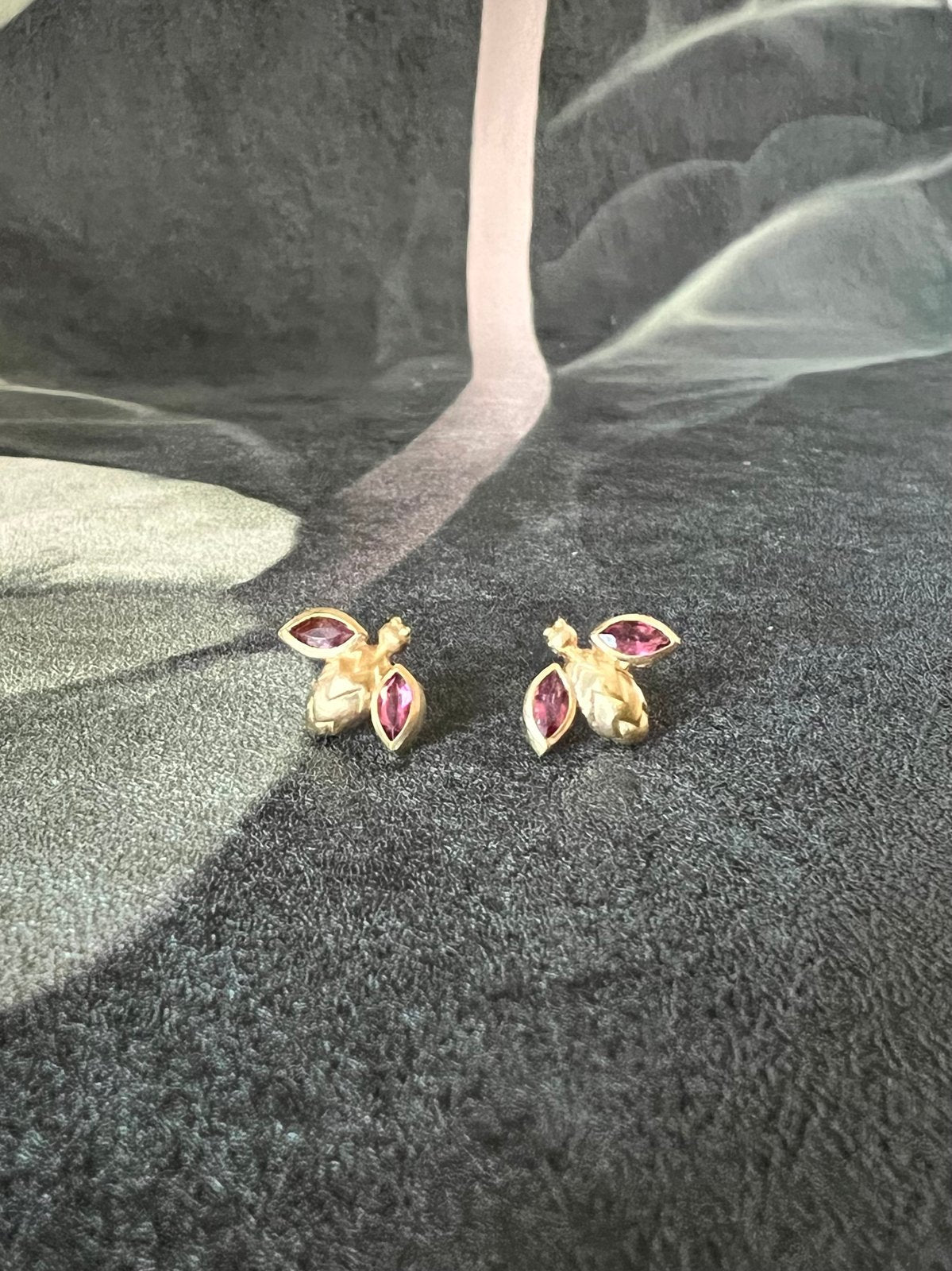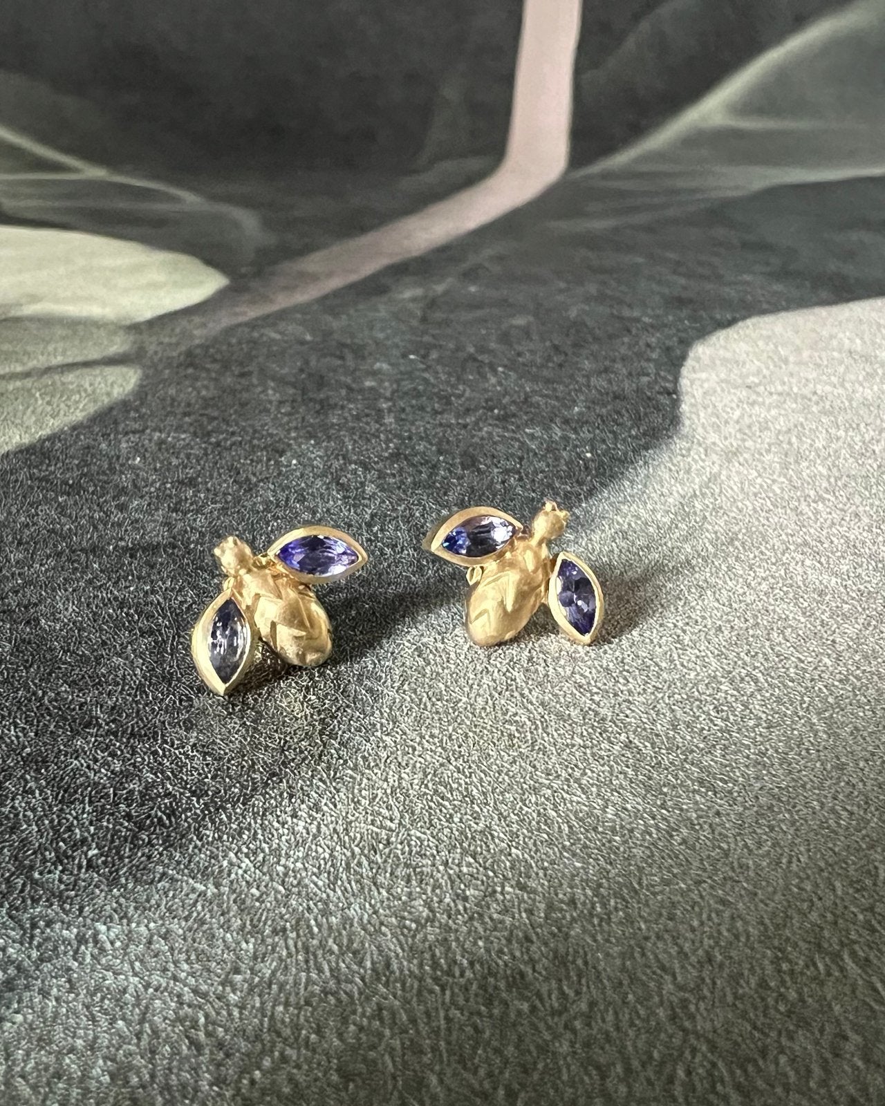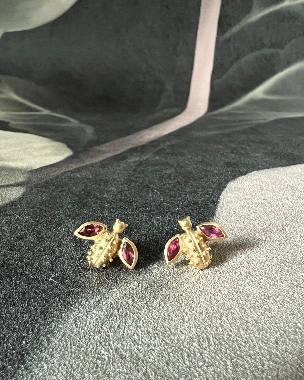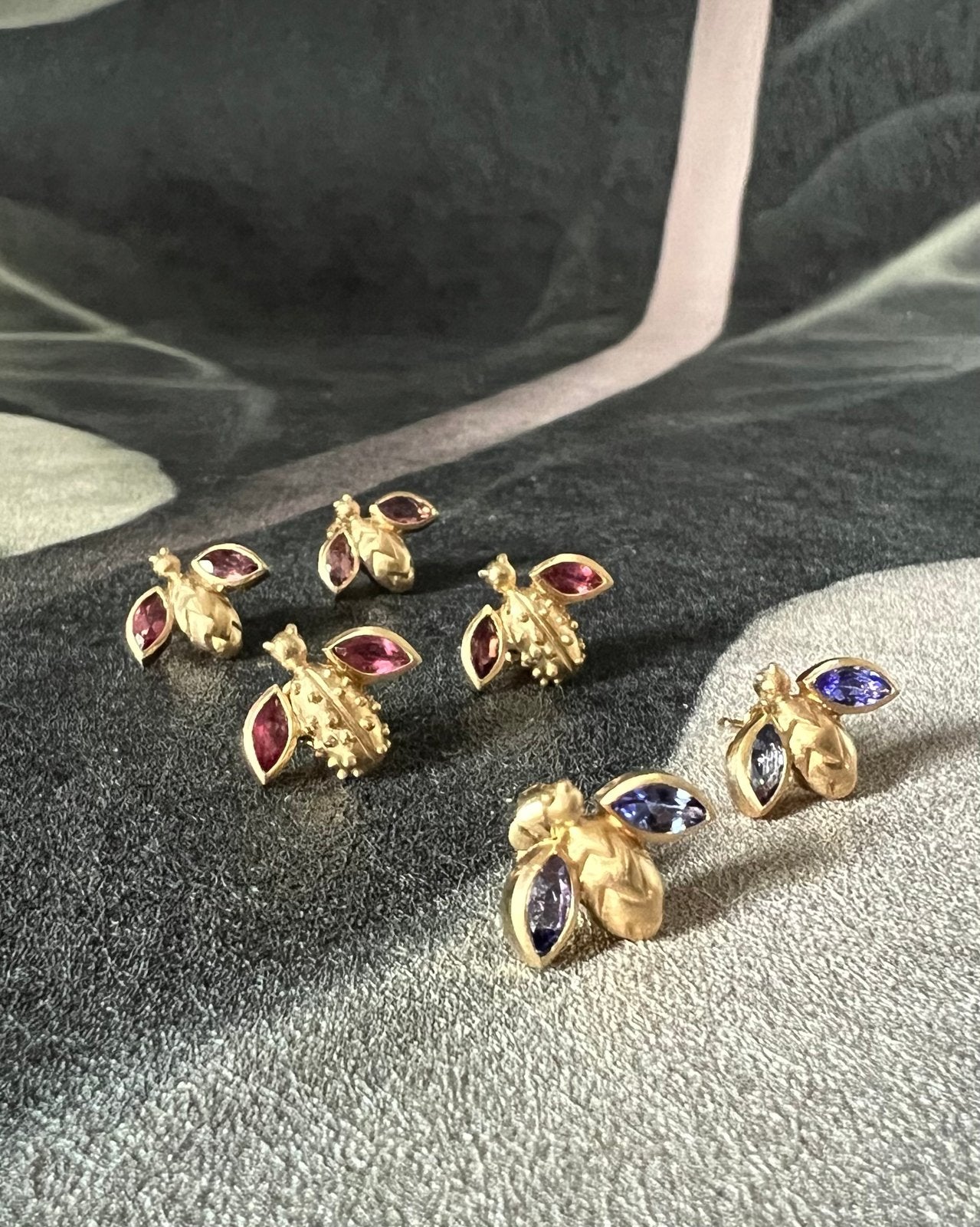 Tiny bug earrings carved in wax and cast in 18 karat gold and set with marquise pink tourmalines or blue tanzanites.