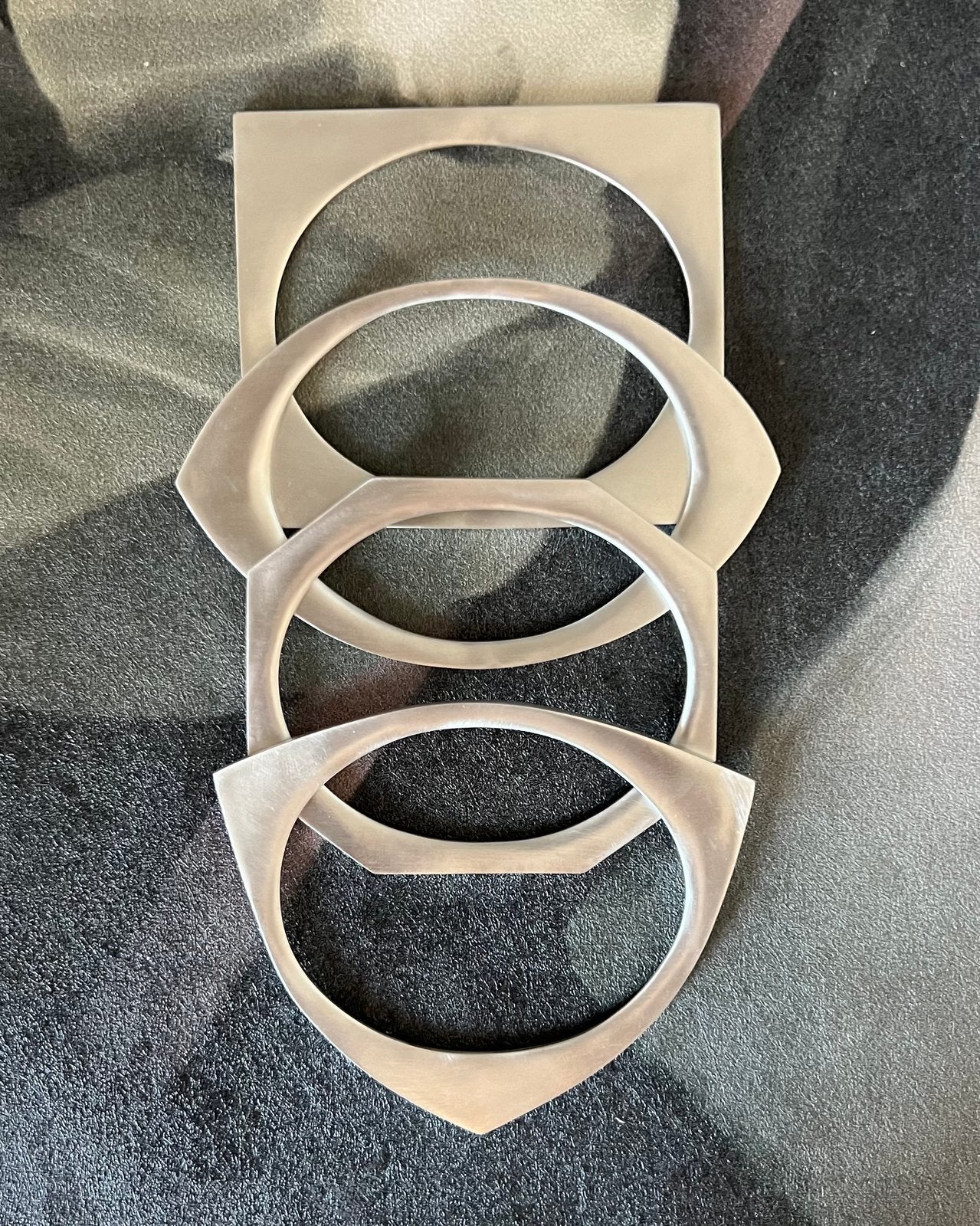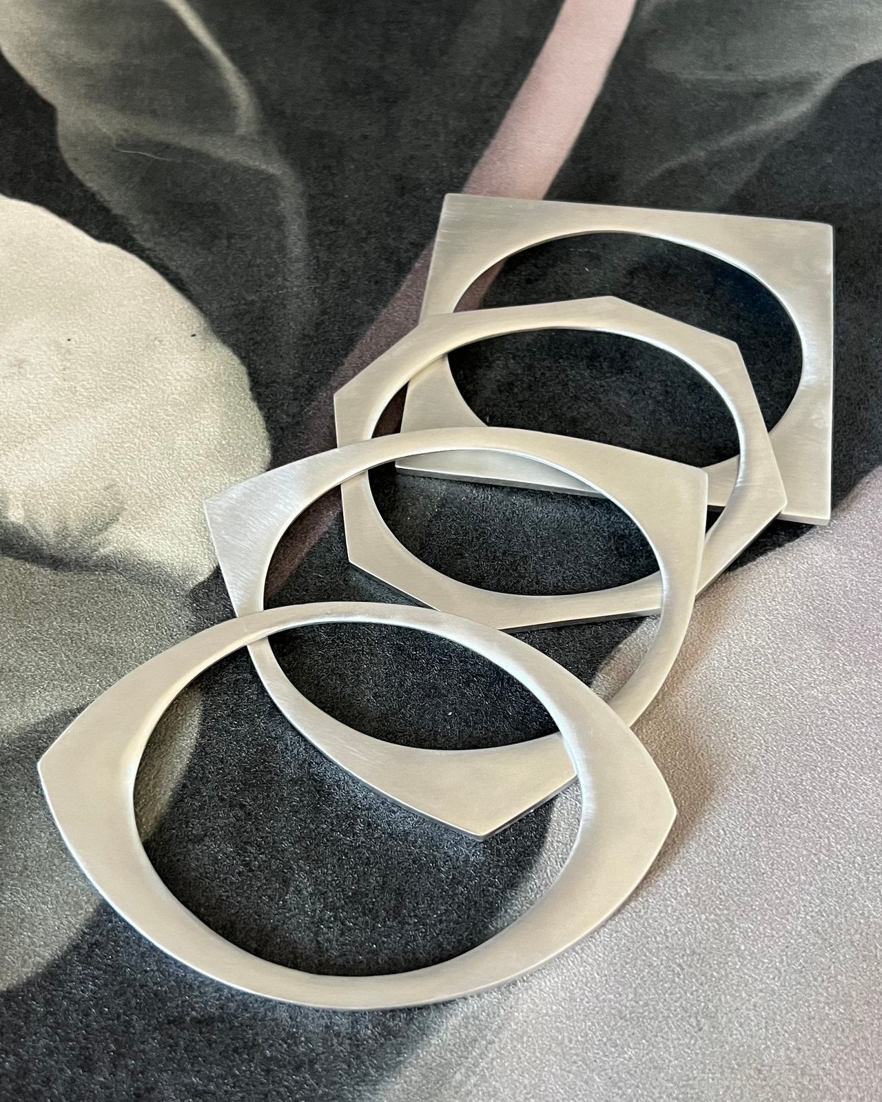 Smooth untextured bangles, in oval, triangle, octagonal and square shapes carved in wax and cast in sterling silver.
