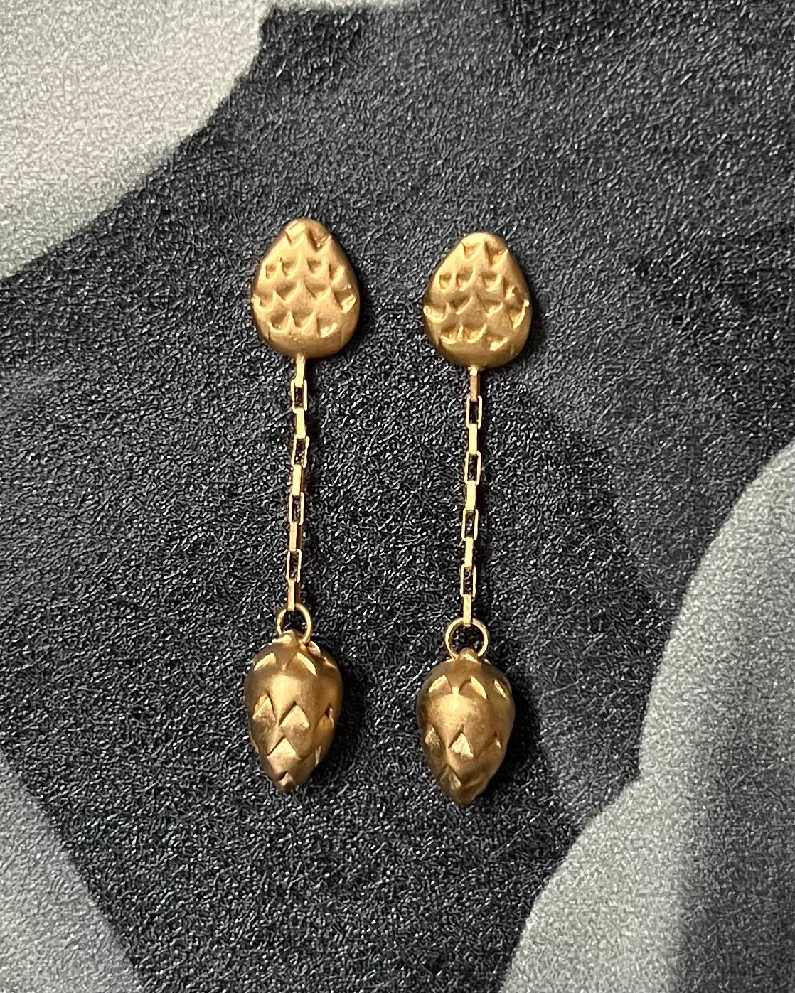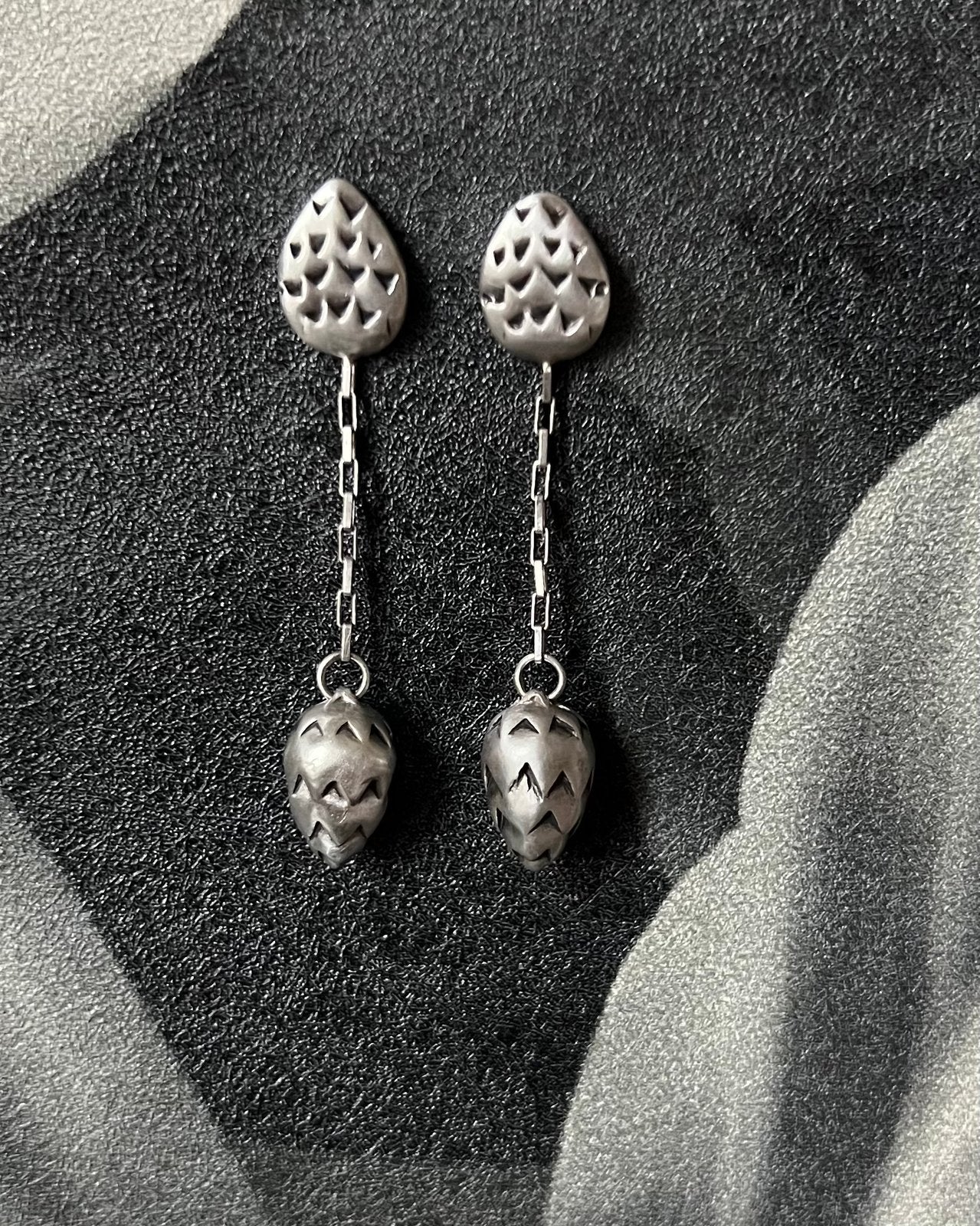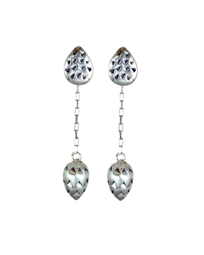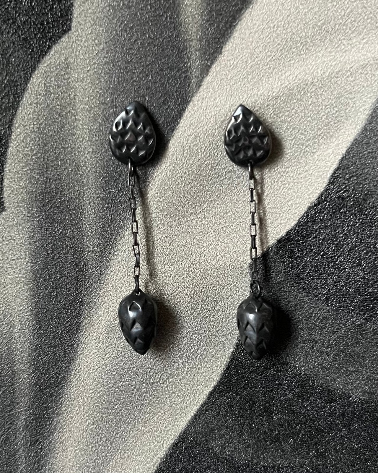 Flat egg shape post and dangling round egg charm connected by elongated square chain. Each piece carved with abstract serpentine texture. Cast in sterling silver and oxidized to accentuate texture.