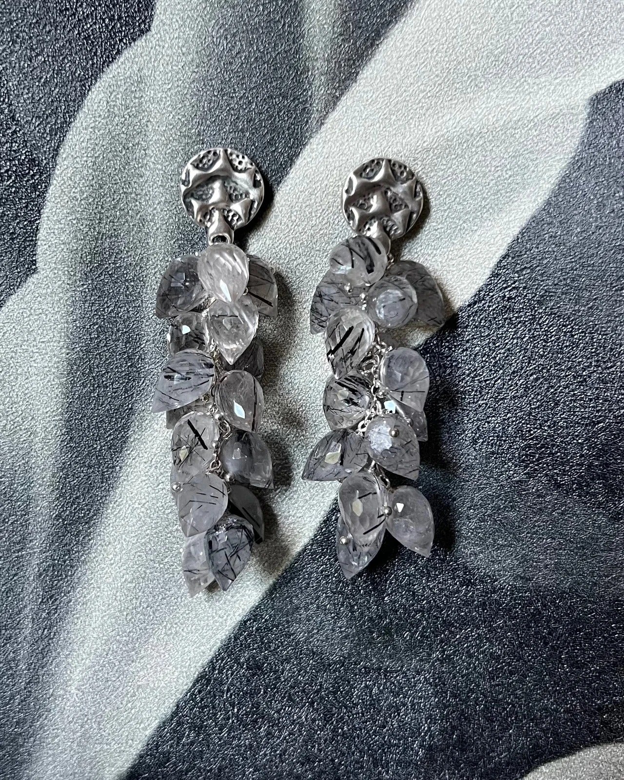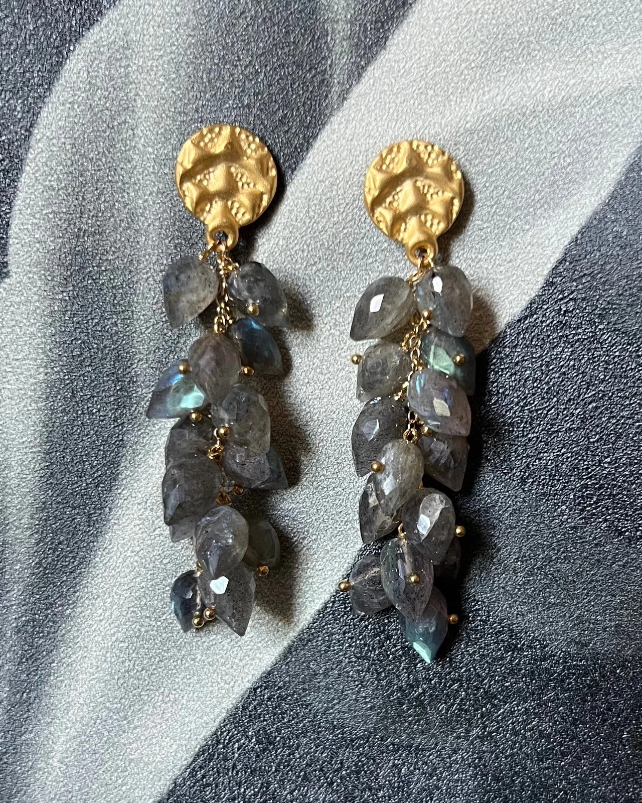 Mimi post earring, carved in wax and cast in bronze with 5 micron (aka 2x vermeil) gold plating. Cascade of faceted semi precious gemstones hang from gold filled chain.