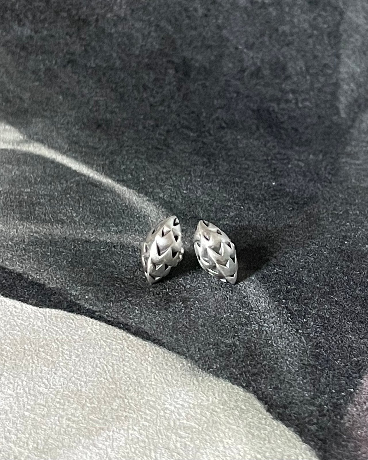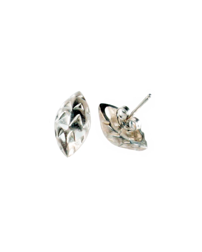 Hand carved earring in small pod shape with serpentine motif. Cast in sterling silver and lightly oxidized to emphasize texture.