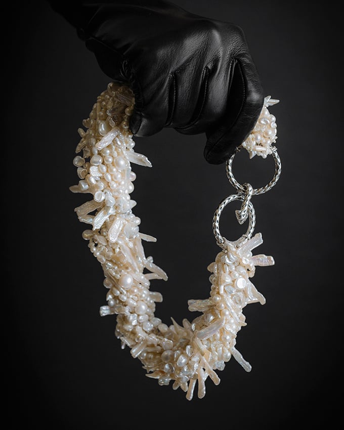 Torsade necklace of 16 strands of freshwater pearls with sterling silver clasp.