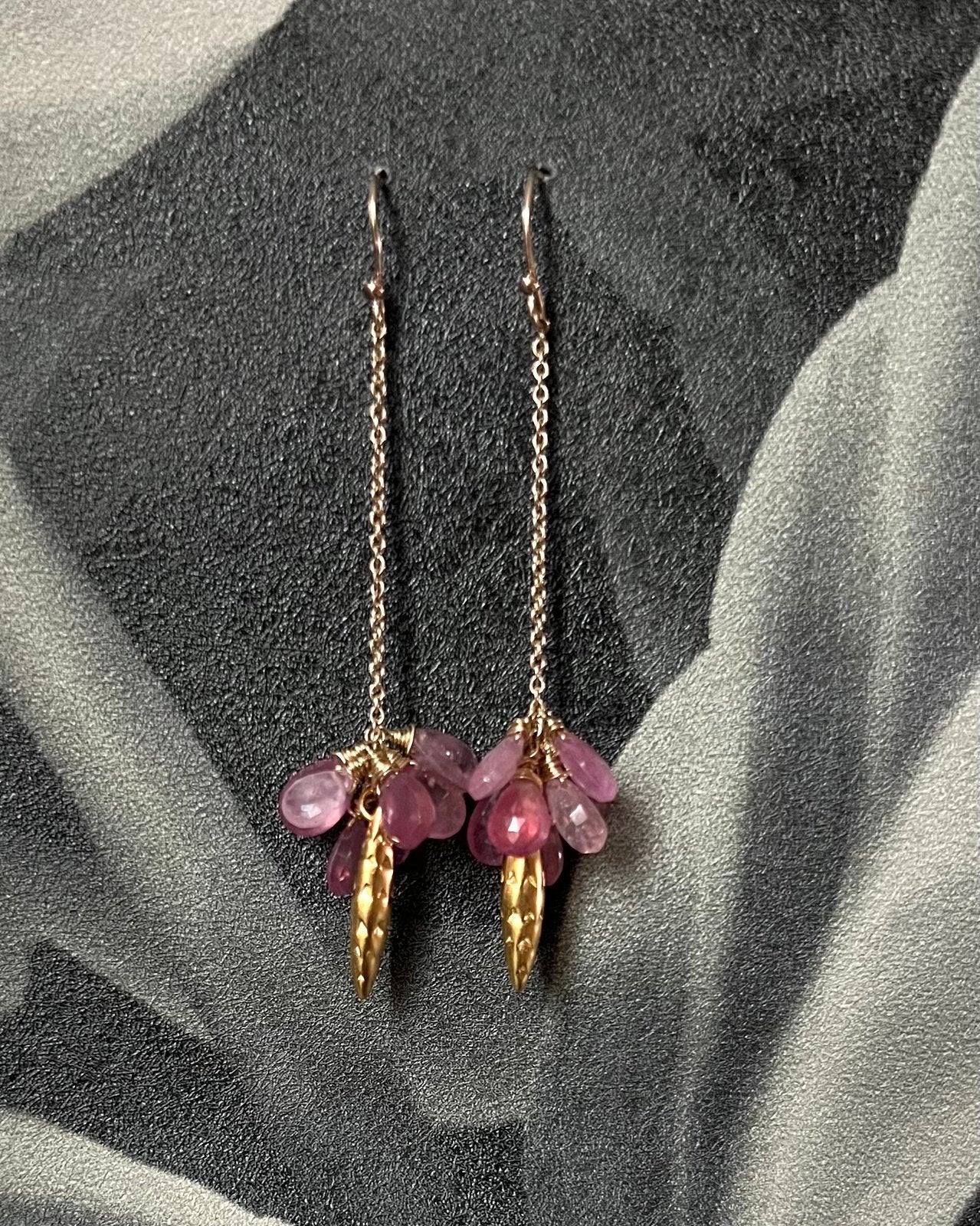 Get your hands on Pantone's color of 2023 with these faceted tourmaline drops hanging on a chain from a french wire above a cast serpentine carved pod. Gold filled chain and ear wire. Hang 7.5cm or 3". ONE OF A KIND!